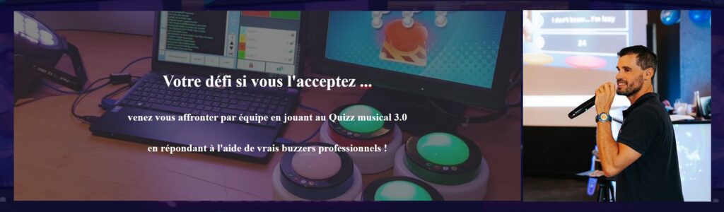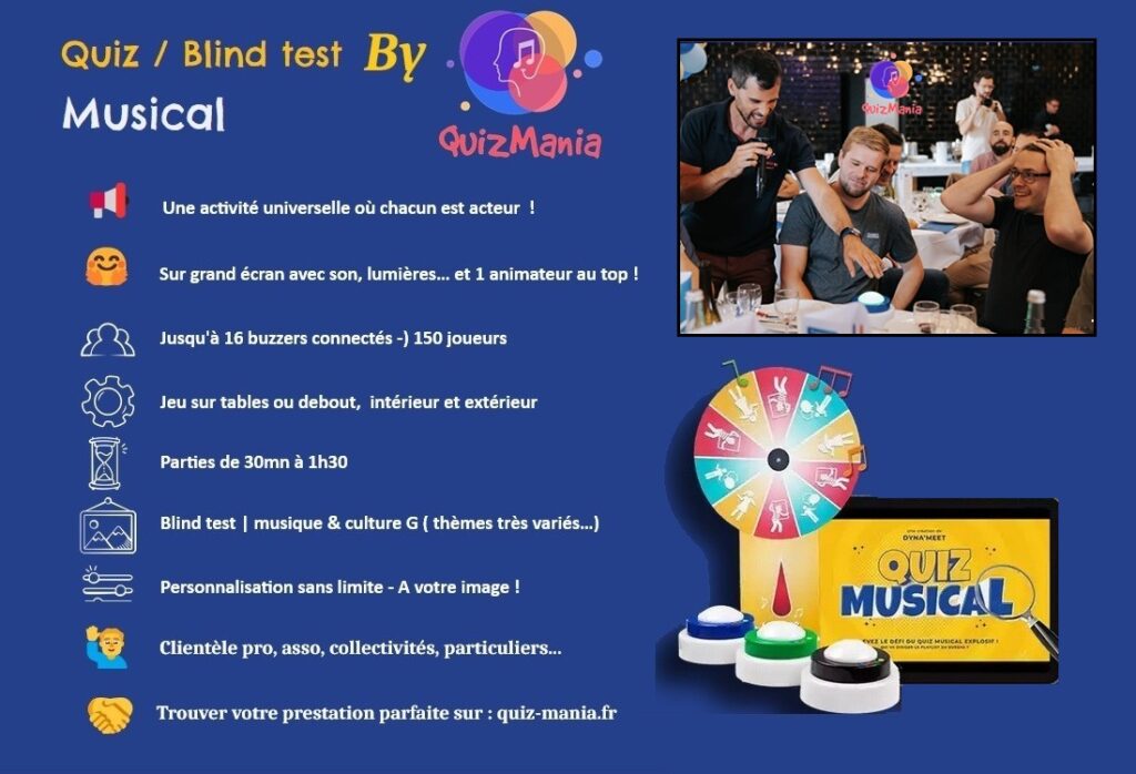 👍 Quiz’party, karaoké, blindtest musical , bar/pub, evg / evjf, réceptions et cocktails, afterwork, soirée étudiante, thématique, animation centre culturel / camping club, établiss spécialisés, collectives, ehpad, maison de repos …